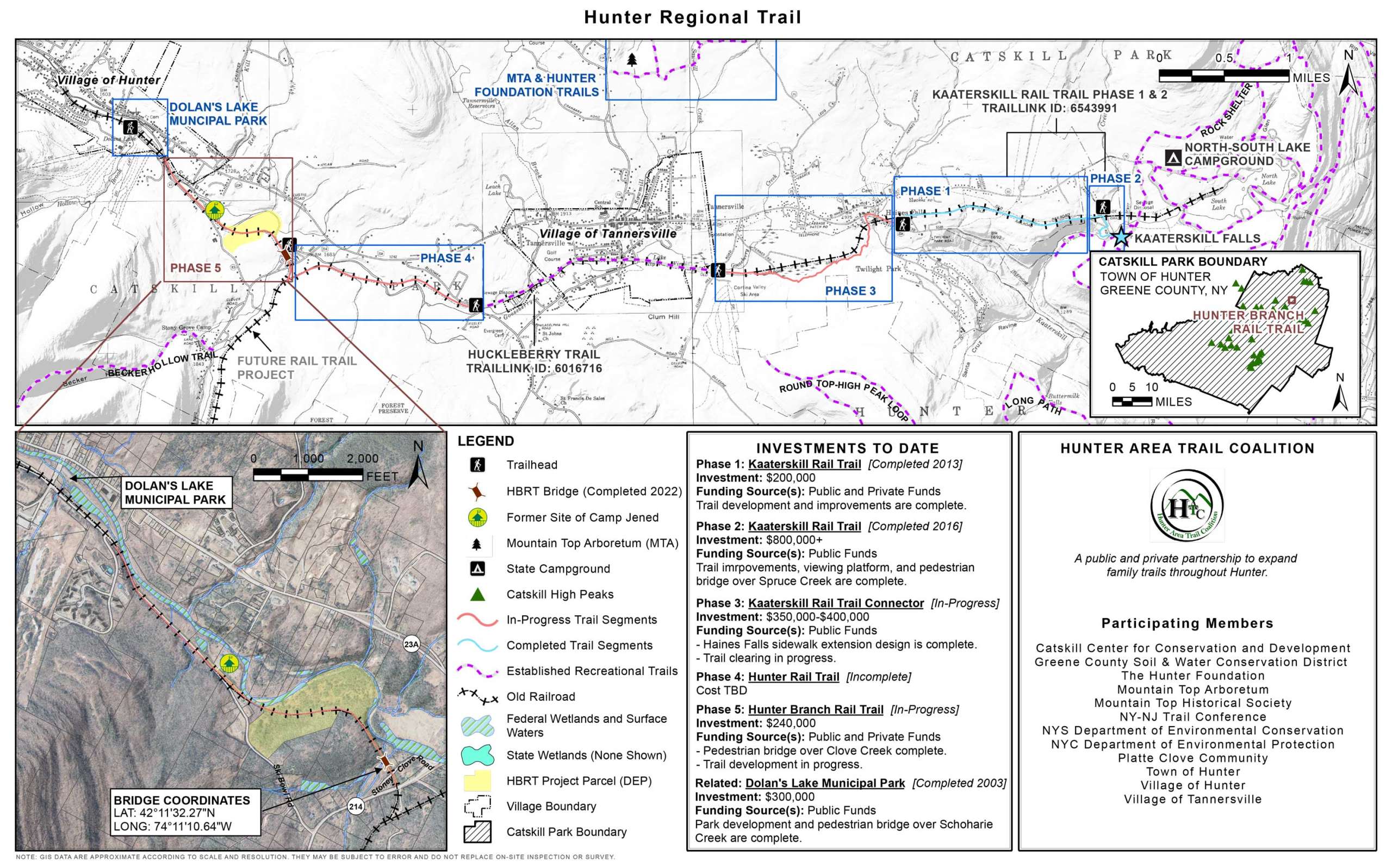 Phase 3 connects the Kaaterskill Rail Trail at MTHS to the Huckleberry Multi-Use Trail in Tannersville. Agreements were secured with three landowners, and the Town of Hunter received a $75,000 NYS Department of Environmental Conservation (NYSDEC) Smart Growth Grant to kick off planning and construction.